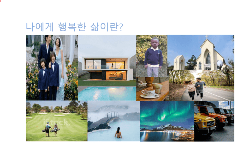 배우자와 아이들과 함께 집에서 웃고 있는 모습. 내가 꿈꾸는 가장 큰 행복의 모습. 사랑받고 사랑하는 관계.  안정감을 느끼는 삶. 무엇보다 신앙 (믿음) 안에서 가정을 세우고, 삶의 방향을 잃지 않는 사람이 되는 것.