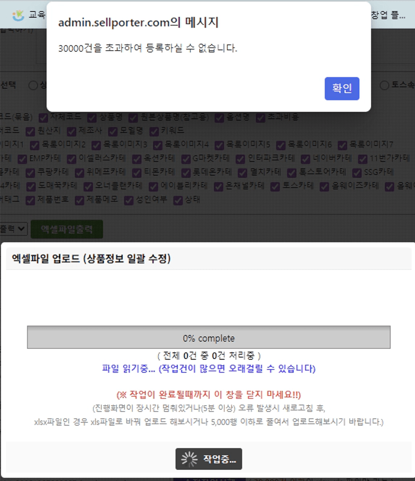 "30000건을 초과하여 등록하실수 없습니다." 라는 에러와 함께 업로드가 안되여..