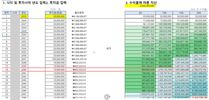 - 수익률 20%: $$세 (2040년)