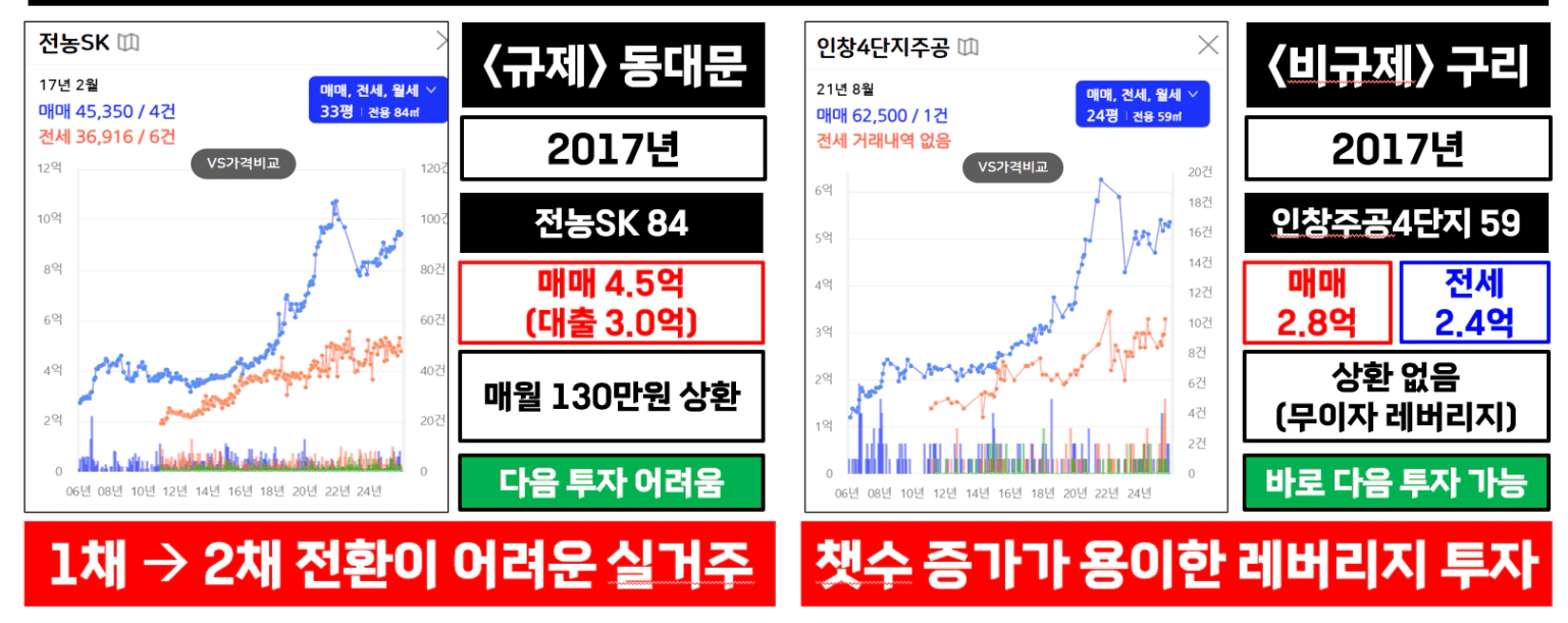 아시다시피 서울 전역이 토지거래허가구역으로 묶인 지금, 서울은 투자가 불가능한 상황입니다. 이 상황 속에서 투자할 수 있는 지역을 나라에서 거의 찍어줬습니다. 안양시 만안구, 군포시, 고양시, 화성시, 평택시, 안산시, 인천… 그리고 구리. 이런 지역들이 현재 수도권에서 실거주를 하지 않고 매수할 수 있는 ‘전세 레버리지’ 투자가 가능한 곳입니다.
