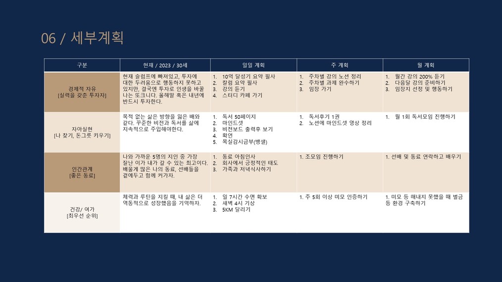 세부적인 항목들은 틈틈히 수정하고 현실화해나가는 과정이 필요하다는 걸 깨달았습니다.