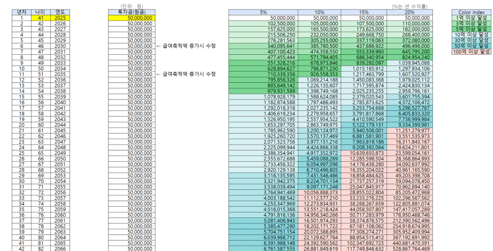 - 수익률 20%: 55세 (2041년)