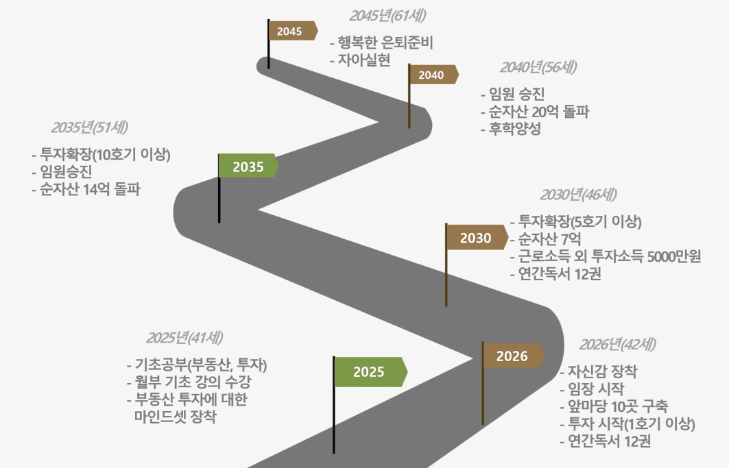 비전보드 실현을 위해 5년 단위로 20년 계획을 세워봅시다. (2025/ 2030/ 2035/ 2040/ 2045년)