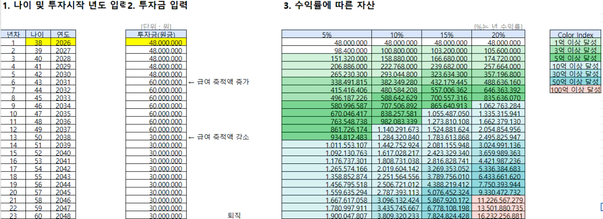 목표 금액 36억 (현재 나이 38세, 연저축액 4800만원에서 시작)