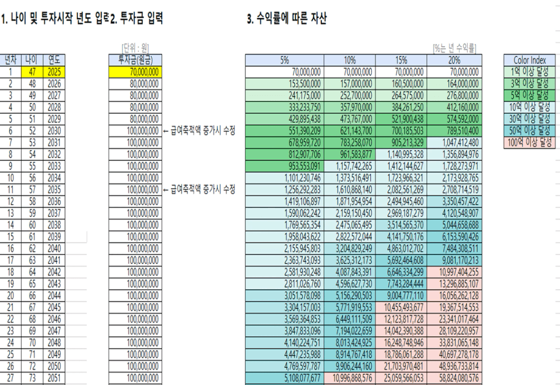 목표 금액 50억 (현재 나이 47세, 연저축액 7000만원에서 시작)