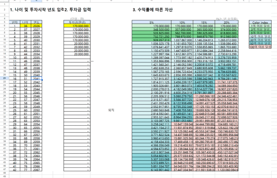 목표 금액 100억 (현재 나이 36세, 투자금 1.7억으로 시작)