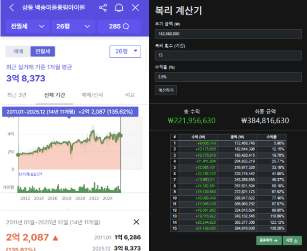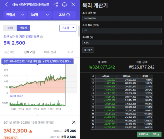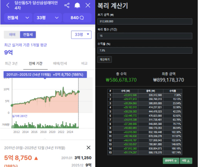 아래와 같이 몇 개의 단지의 그래프를 보여드리려고 합니다. 15년간 연복리로 전세가가 몇퍼센트씩 상승했는지 보이시나요?