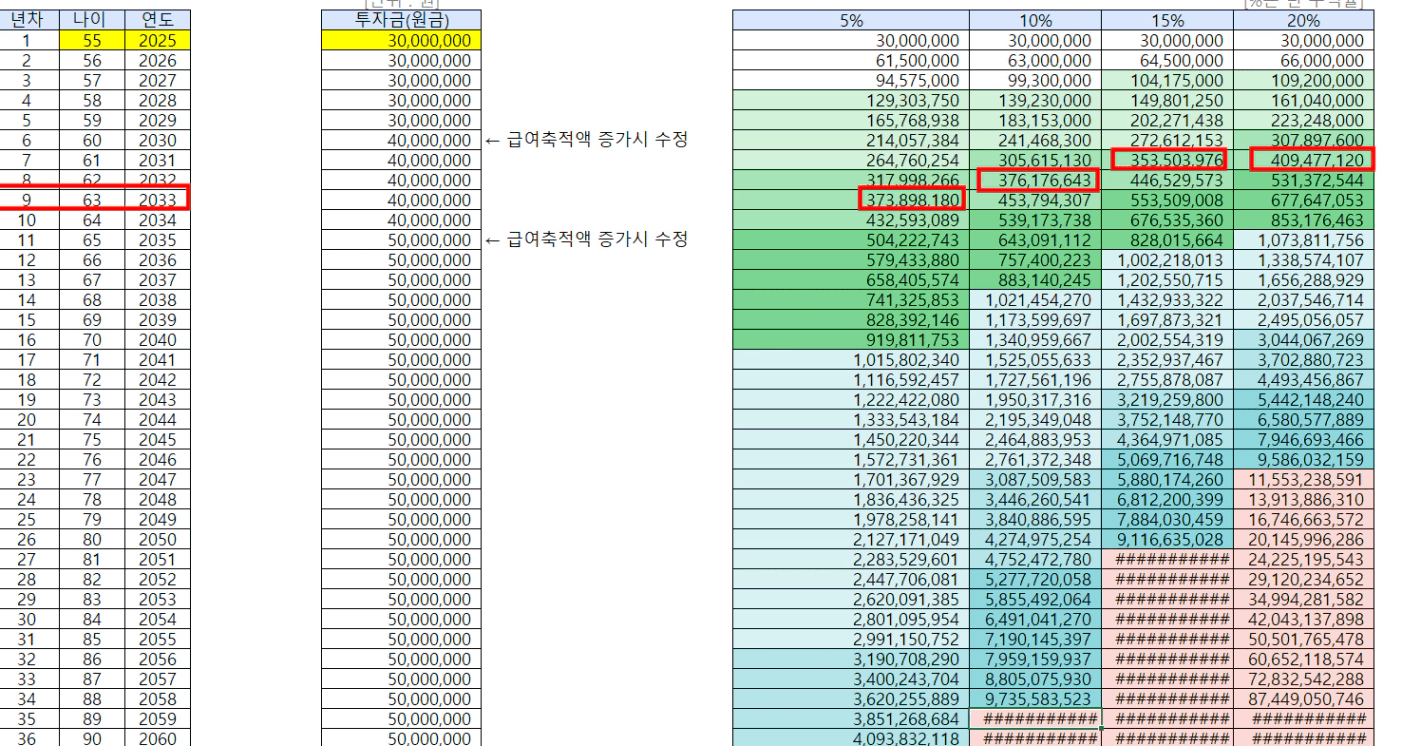 목표 금액 37억 (현재 나이 55세, 연저축액 3000만원에서 시작)