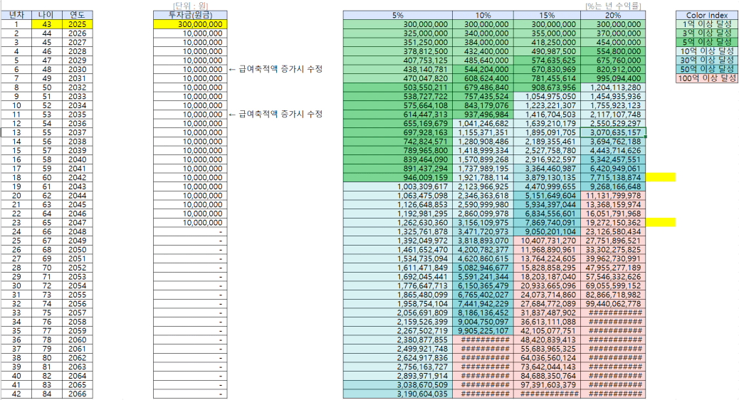 - 수익률 10%: 58세 (2049년)