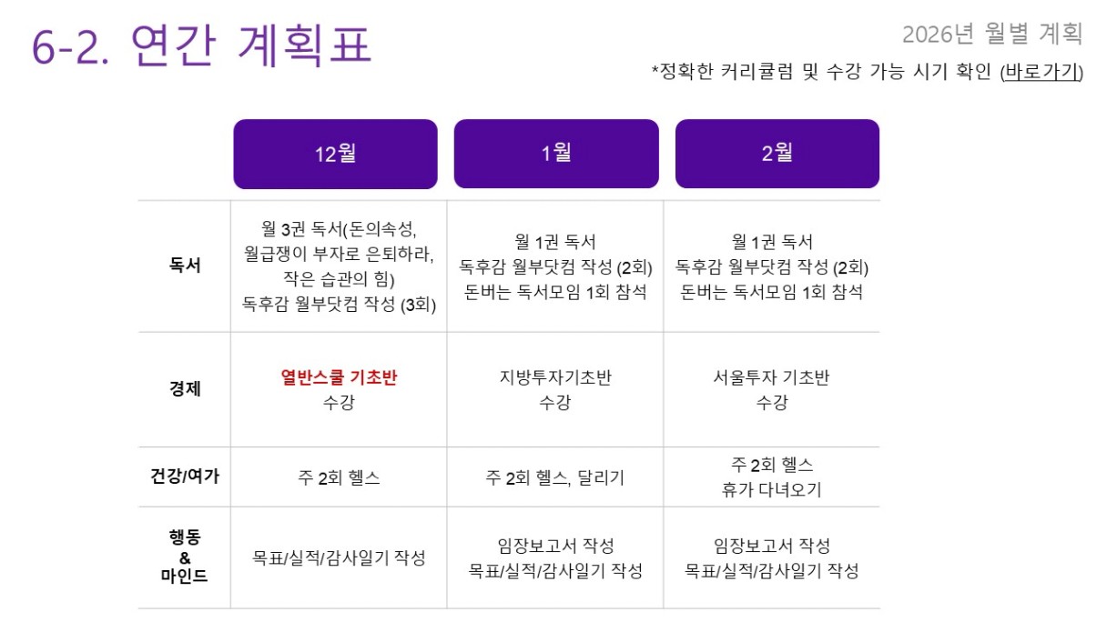 - 투자: 고정지출 재정비 (급여, 이자, 저축 등 정리), 열반 기초반 수강