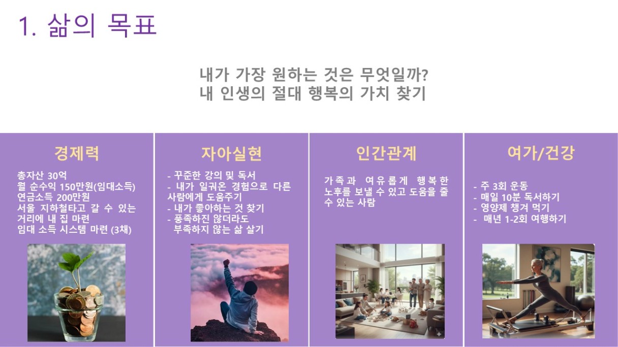 - 인간관계: 주1회 동료에게 안부 묻기, 월1회 가족들과 나들이