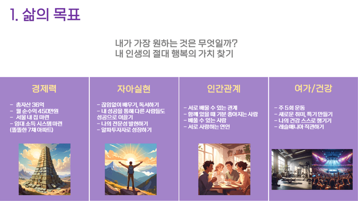 운동하는 삶 / 배우고 또 가르치는 삶 / 멋진 내 집에서 투자를 복기하는 저녁이 있는 삶 / 사랑하는 사람과 함께 하는 삶 / 레슬매니아를 직관하는 경험이 있는 삶 / 소중한 반려동물과 함께 하는 삶 / 함께 성장하며 나아갈 지인들이 있는 삶