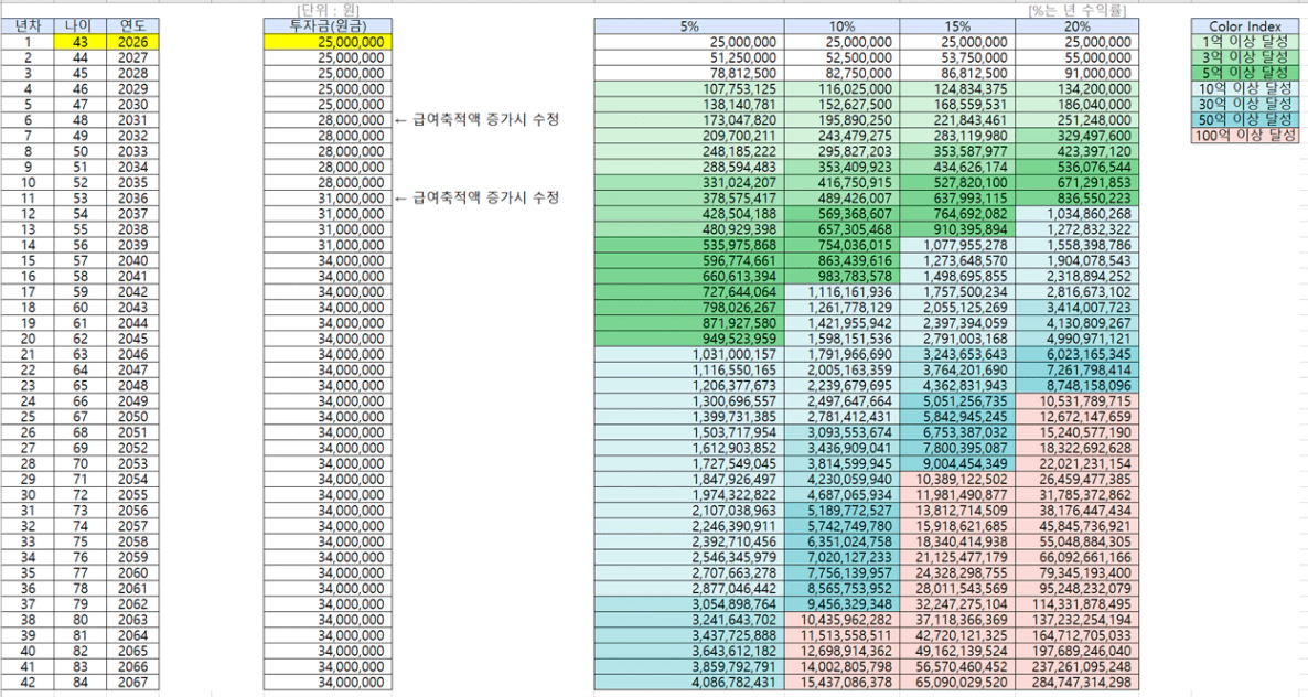 목표 금액 33.4억 (현재 나이 42세, 연저축액 2500만원에서 시작)