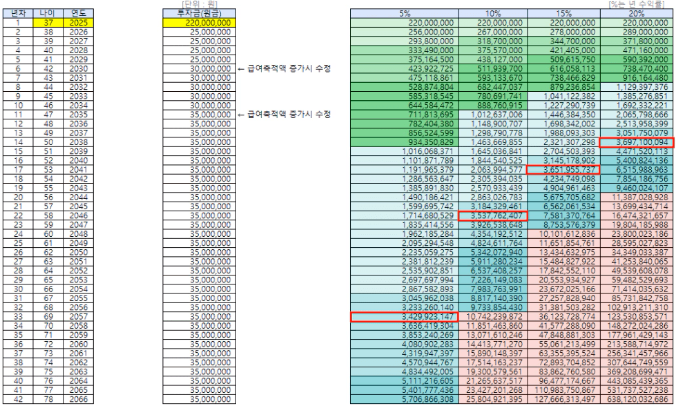 - 수익률 20%: 50세 (2038년)