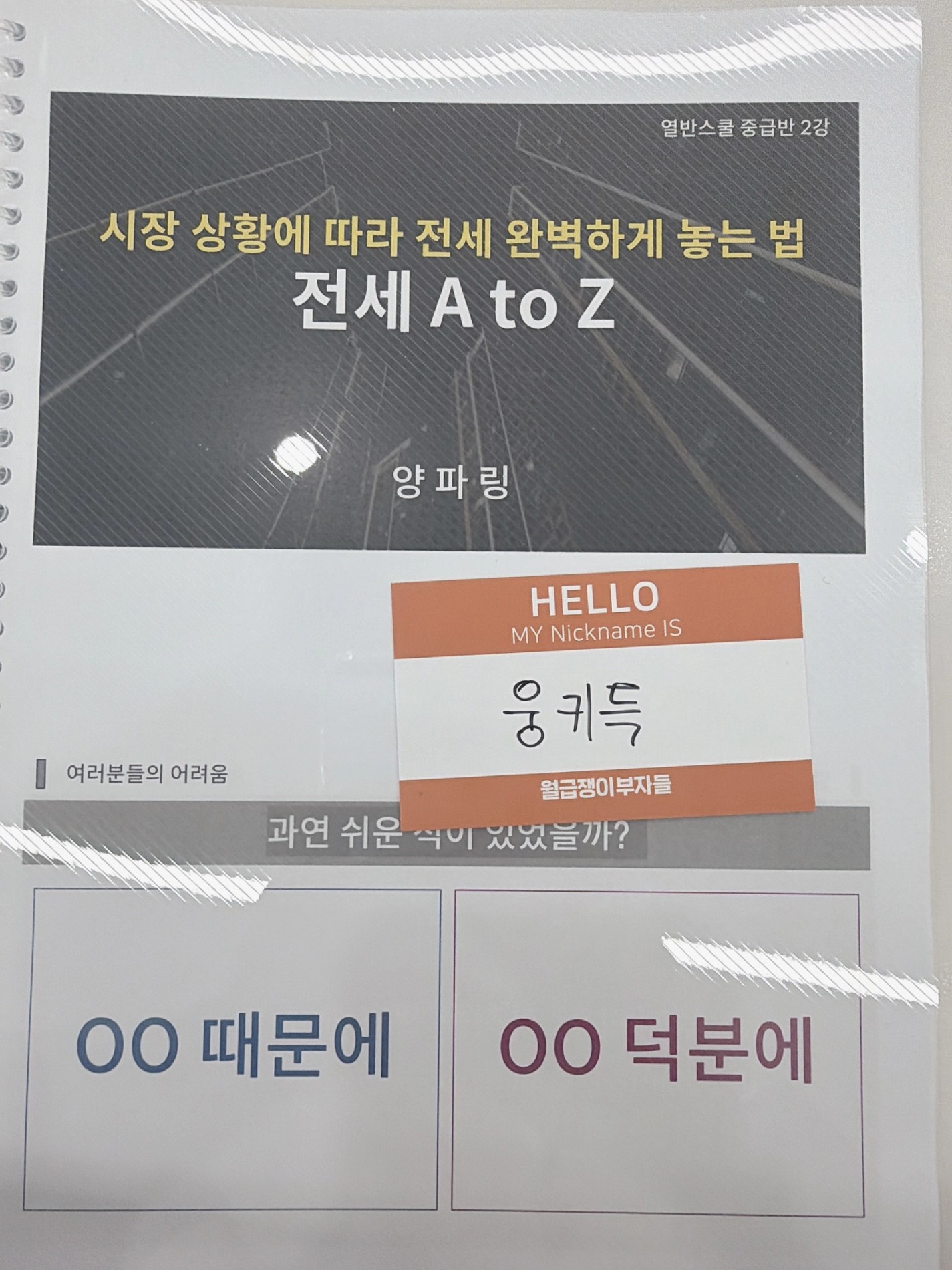 열중반을 수강하게 된 계기가 2강의 전세빼기 내용 때문이라고 해도 과언이 아닌데 이 강의를 직접 듣게 되어 열정이 뿜뿜했다. 그리고 나는 평소에 2배속으로 강의를 듣는데 처음으로 정속으로 말씀하시는 양파링님의 목소리를 듣게 되었다. 꾀꼬리 같은 목소리셨지만 어색했다.