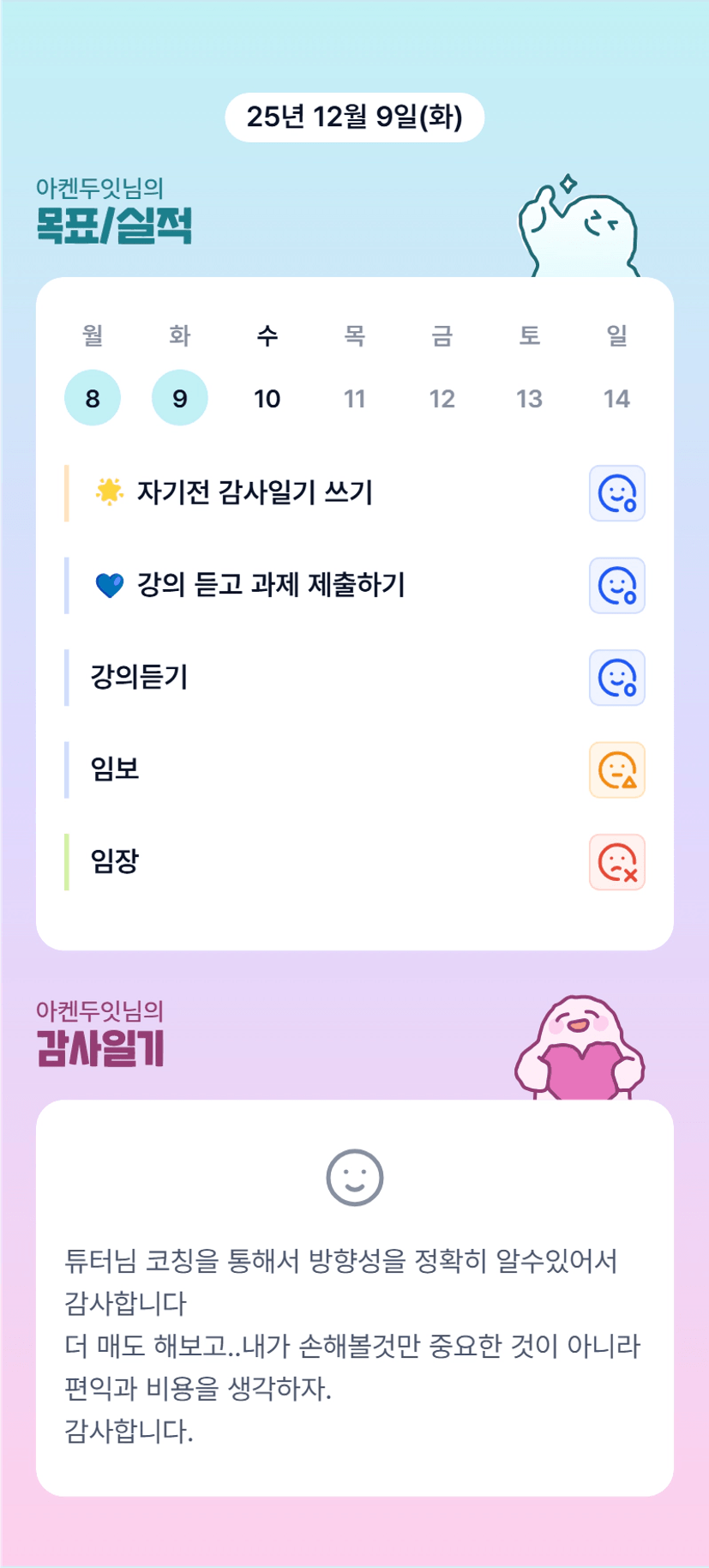 캬..... 방향성 정확히 파악되셨군요! 진짜 알잘딱깔센 튜터님>< 최고!!!!!!!! 두잇총무님 너무 든든합니다!!!!