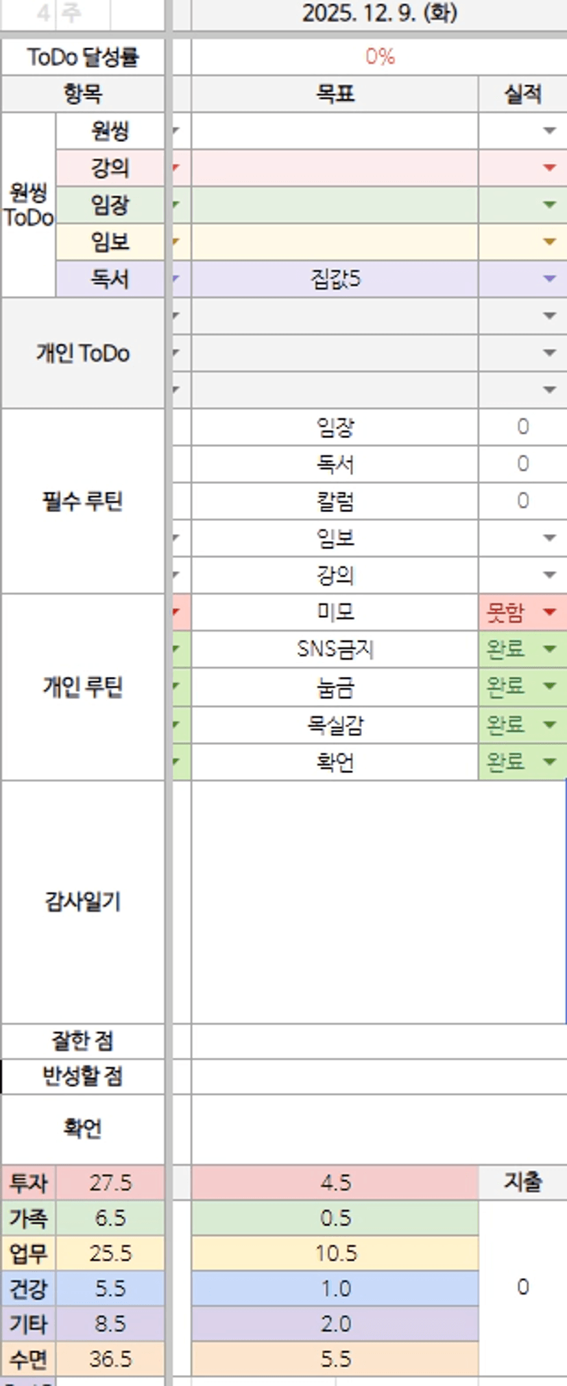 -해야 할 일을 하지 못한 채 저녁에 졸려서 침대에 누운 점