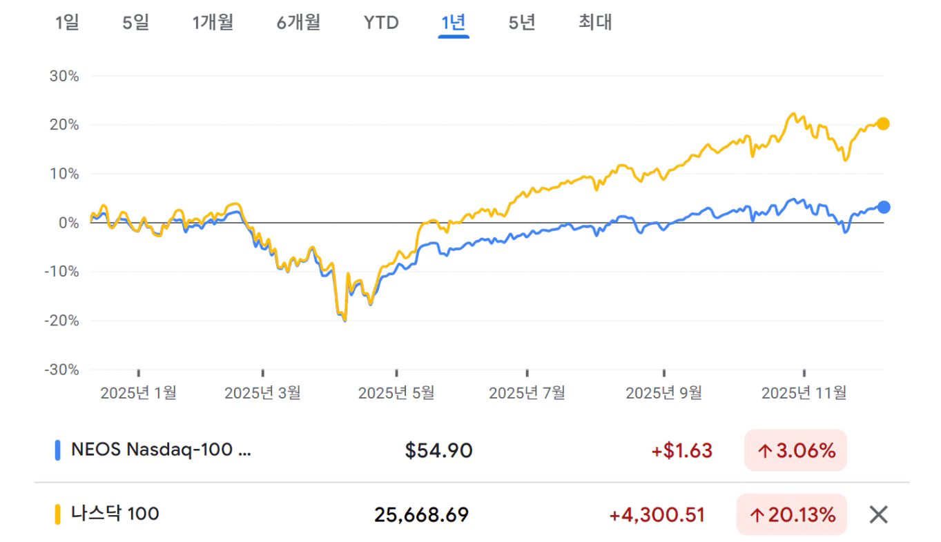이러한 약점이 있기도 하고, QQQI가 출시된지 얼마 안 되어, 큰 하락장을 경험한 적이 없지만, 2025년 4월 트럼프 관세폭탄으로 나스닥이 급락할 때를 나스닥과 비교해보면, (풋옵션 매수 전략으로 하락 방어한다고 하지만) 하락을 방어하지 못했습니다.