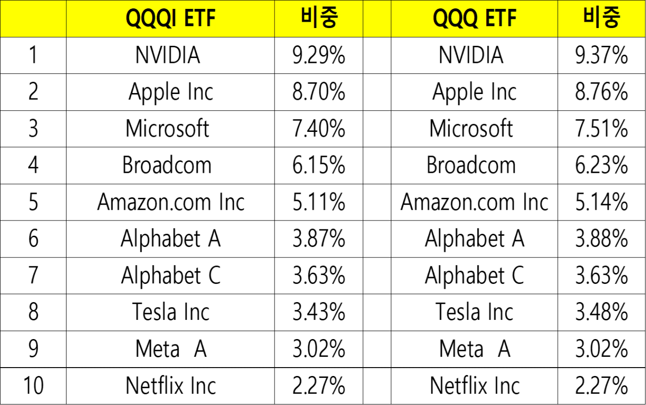 QQQI ETF 상위 10종목과 QQQ ETF 상위 10종목 비교