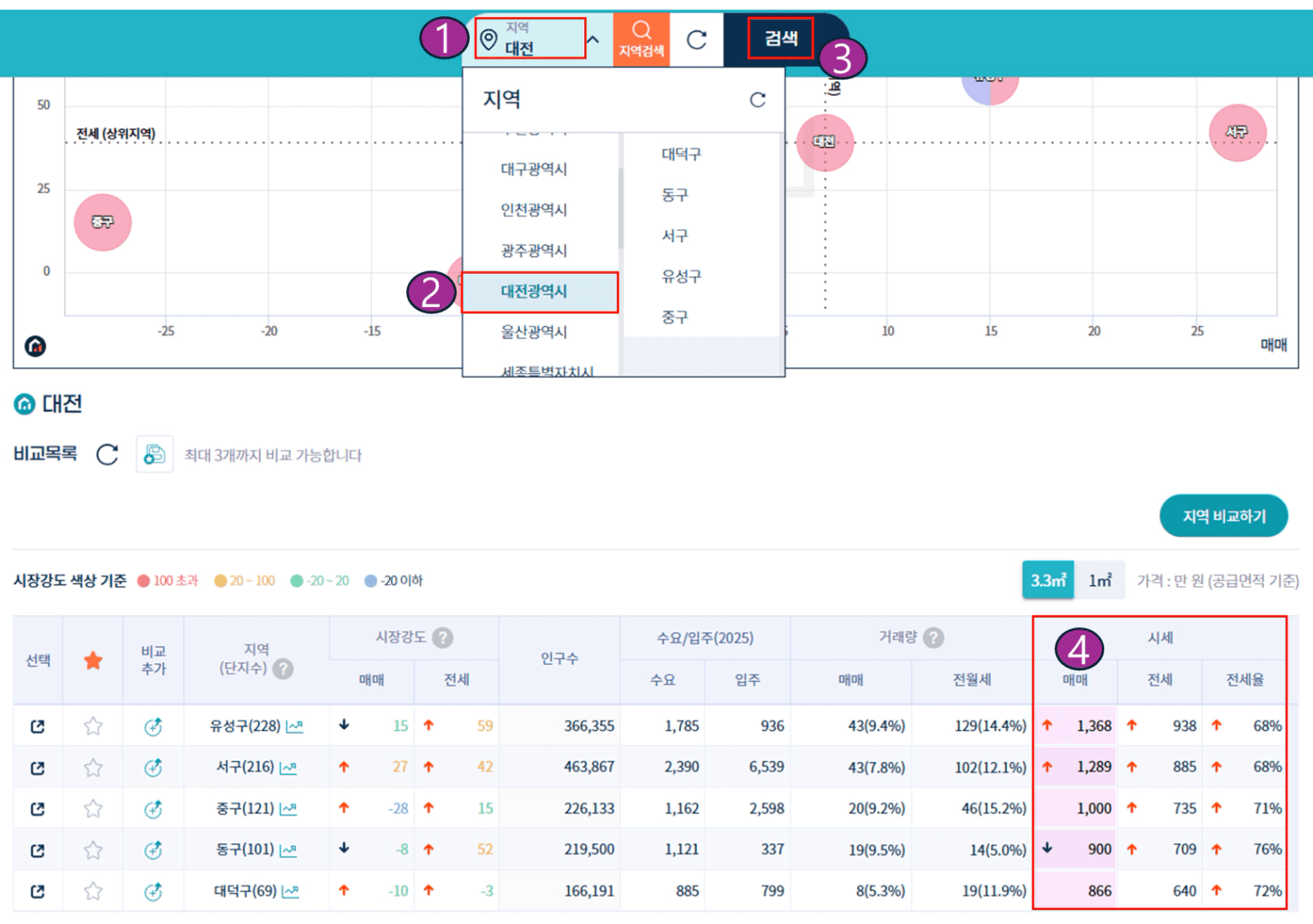 * 만약 전국이 아닌 지역(임장지)의 시세를 보고 싶다면? ex) 대전광역시