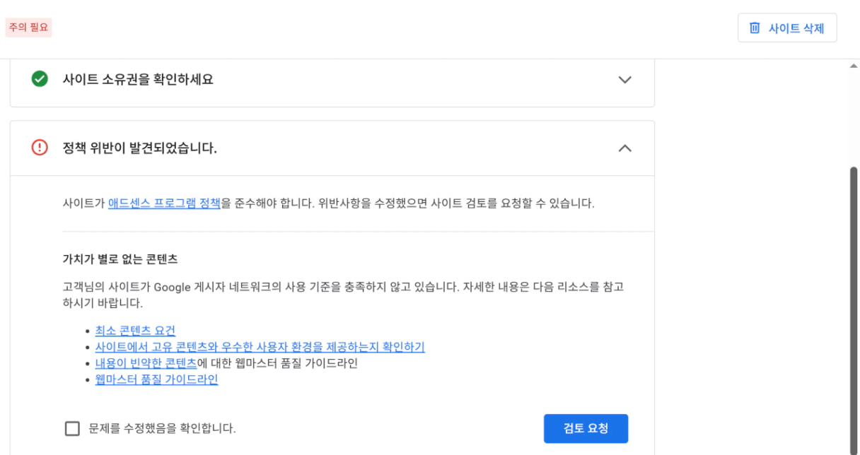 2. 그리고 제 도메인을 클릭하니 이런 이유가 나왔는데 정책위반은 제가 뭘 잘 못 한걸까요?
