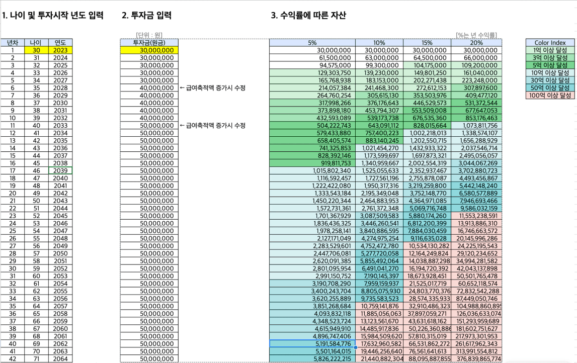 - 수익률 20%: 48세 (2041년)