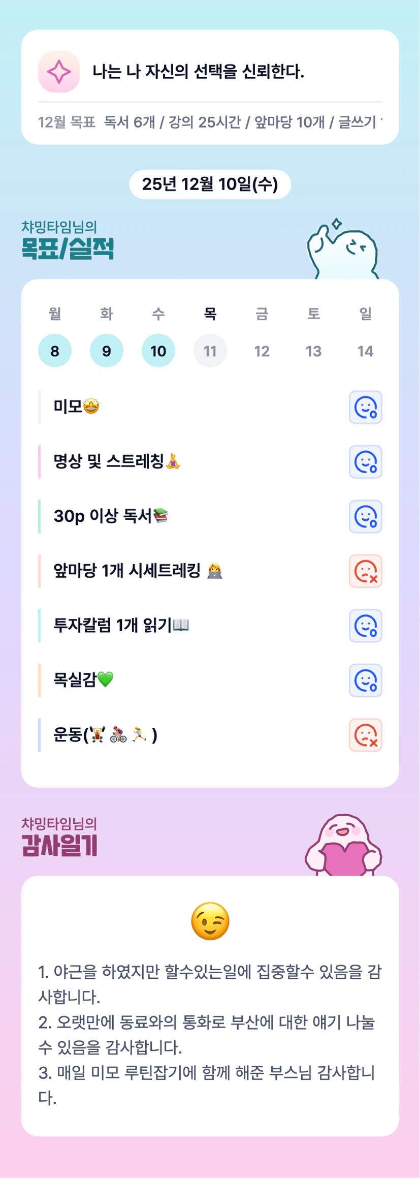 우앗!! 여전히 성실하고 멋지심 챠밍조장님 최고 🧡🧡🧡🧡 저도 아침 미모 다시 도전해야겠어용!! 나 자신의 선택을 신뢰한다!! 아자아자 오늘도 빠이팅이심당