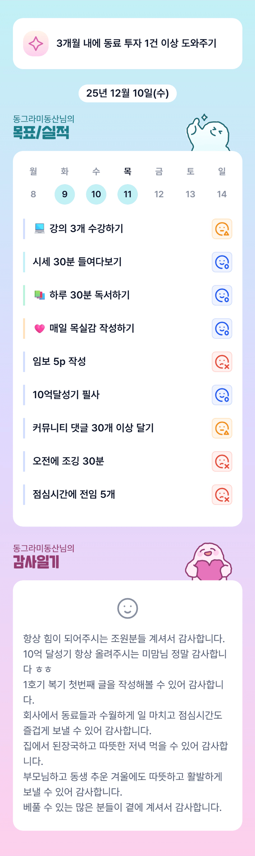 매번 목실감 좋아요 눌러주셔서 감사합니다 동산님! 고생많으셨습니다!