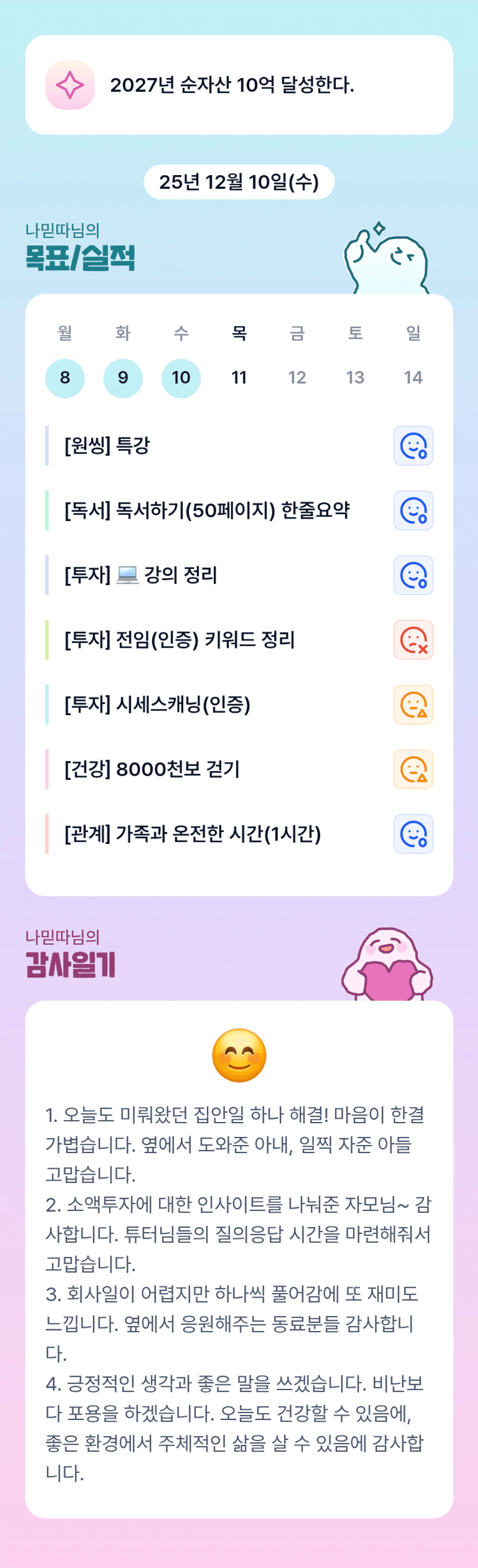 나믿따님 네번째 말씀 너무좋아요~긍정적이니 생각과 좋은말을 쓰겠습니다. 비난보다 포용을 하겠습니다. 오늘도 건강할 수 있음에 좋은 환경에서 주체적이니 삶을 살 수 있음에 감사합니다!ㅎㅎㅎ bm하고갑니다!!