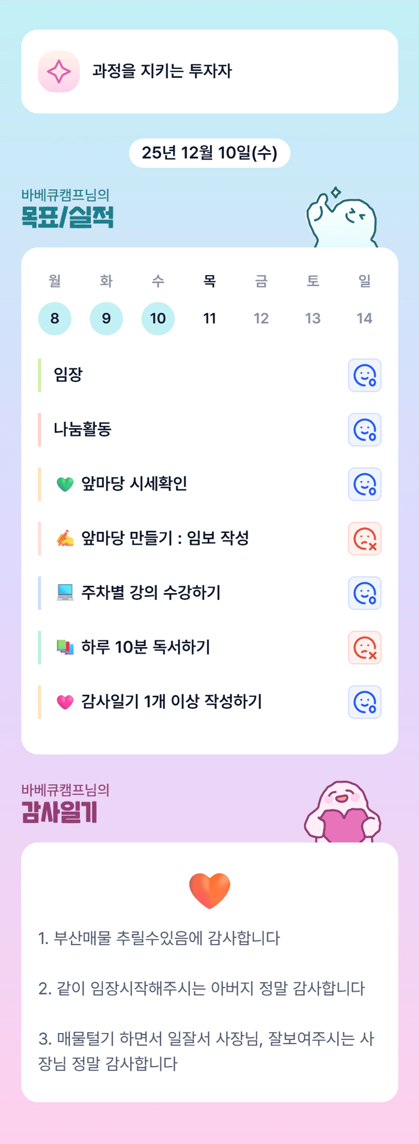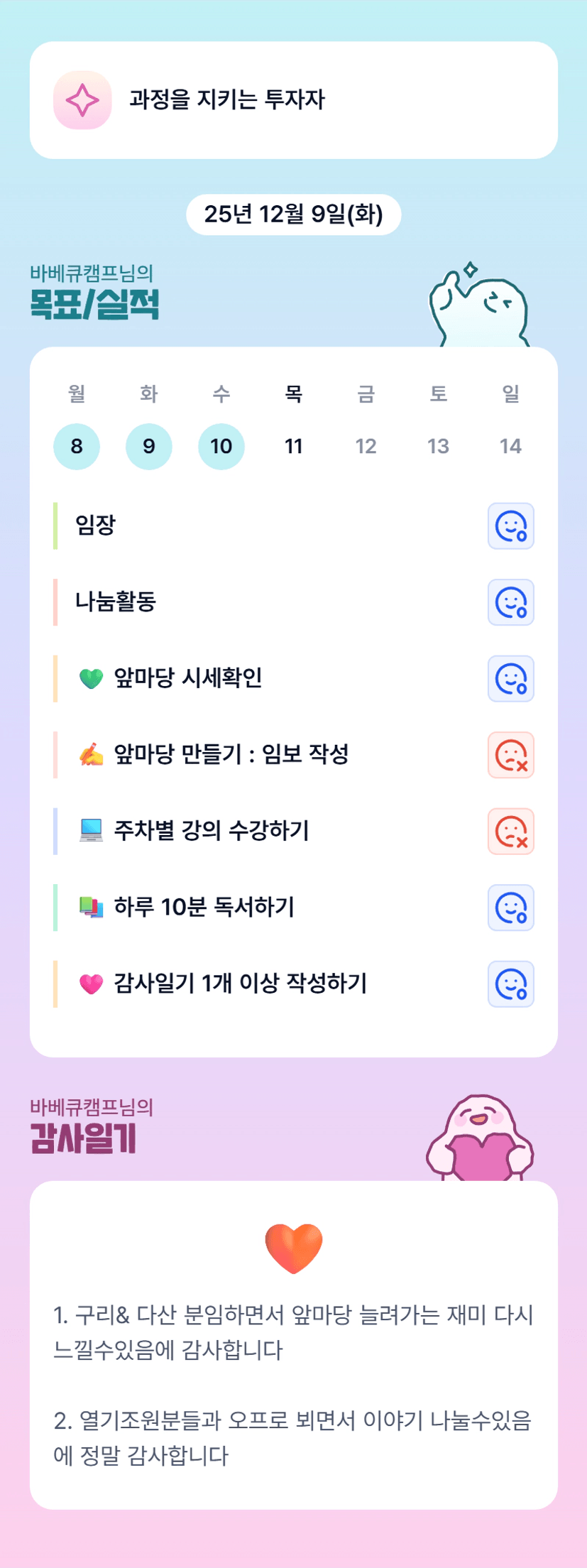 캠프조장님 오프 분임하셨군요!!! 조원분들 너무 좋아하셨겠어요!!! 투자도 화이팅입니다!!