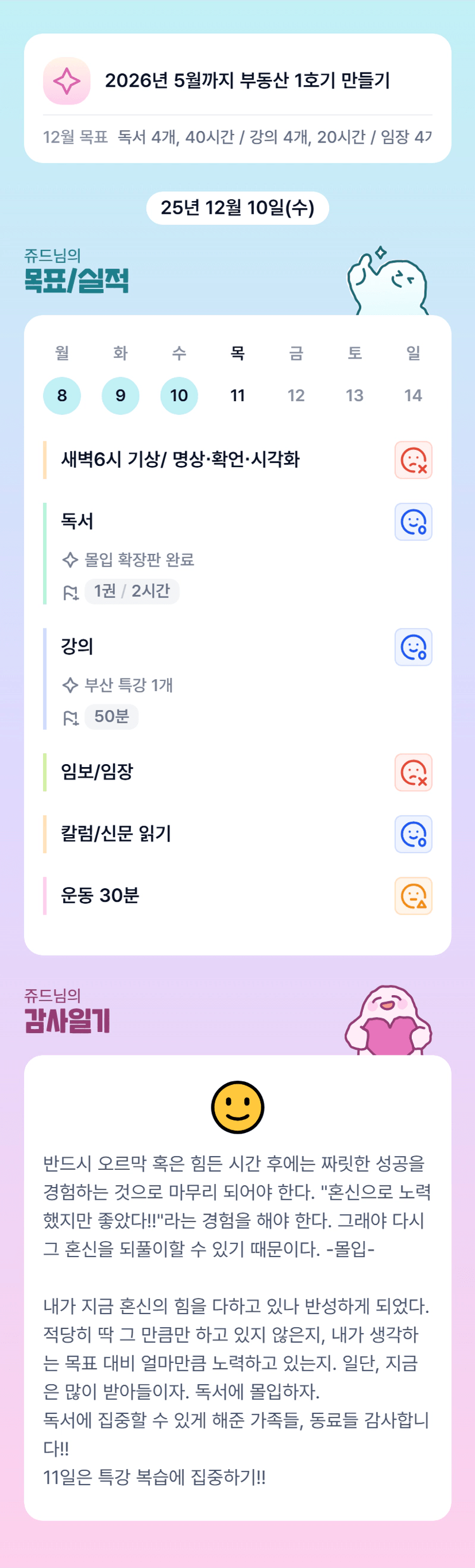 쥬드님 몰입 확장판 완독 멋지십니다. 엄청 열심히 보내고 계신데요!!내년 1호기 위해서 화이팅입니다~~~