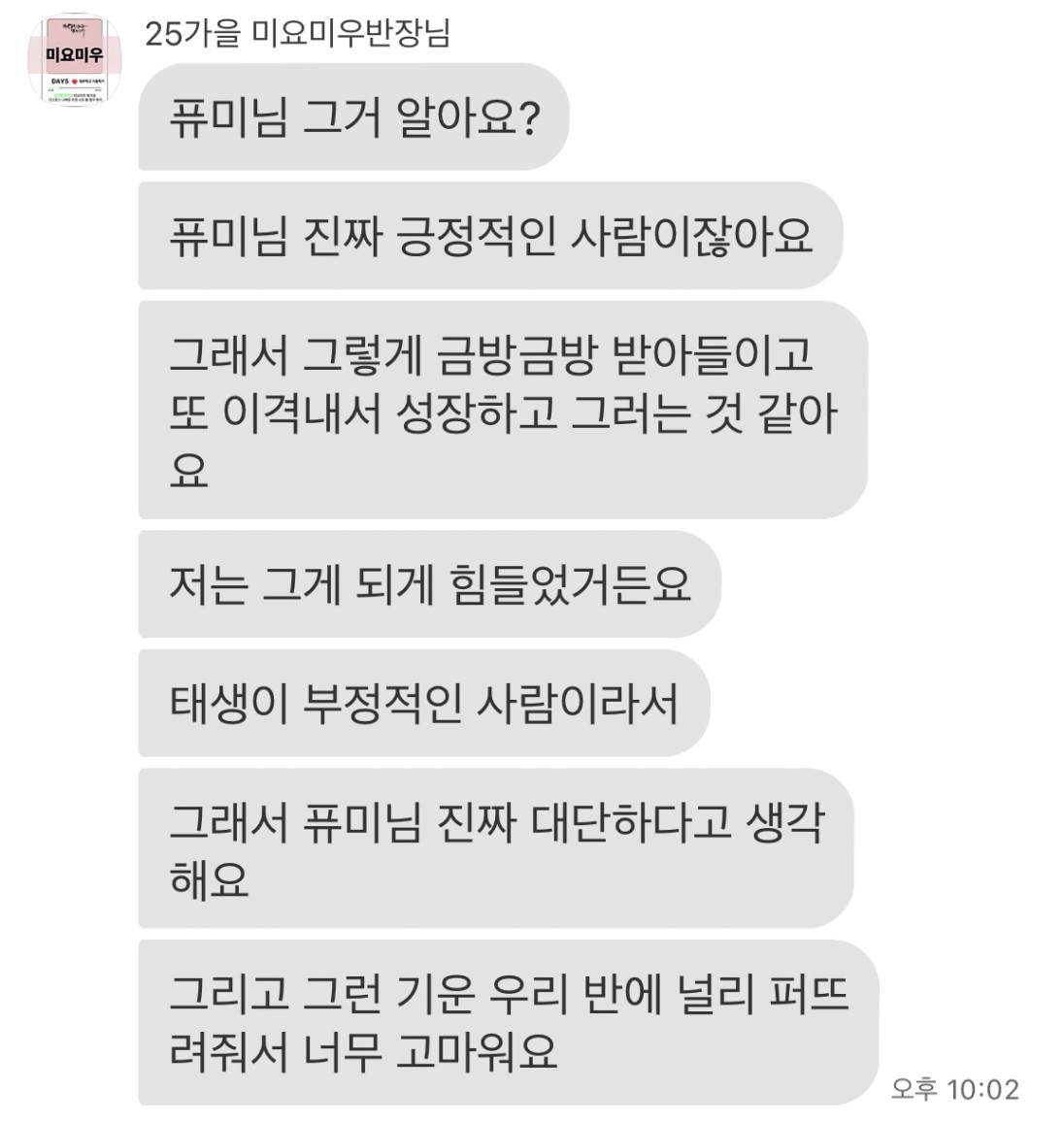 저는 제가 엄청 징징이라서 부정적인 걸 전파하는 사람일까 생각했는데. 긍정적인 사람이고 그걸 반에 전파한다고 해주셔서, 의아하다는 생각이 들었던 거에요.