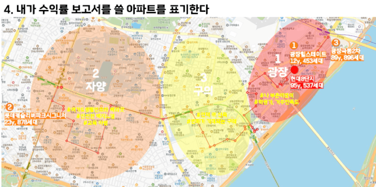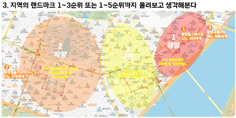 생활권을 나눈 후, 지역의 랜드마크 아파트를 같이 올려서 다시 한번 지도를 째려봅니다!