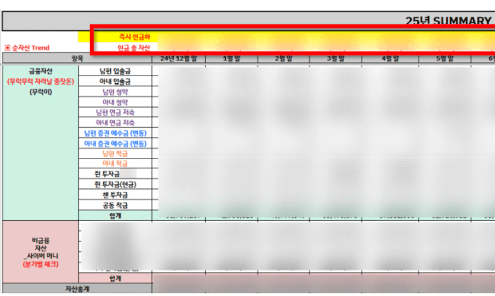 ‘현금 총 자산’이라는 항목으로 합계를 놓고