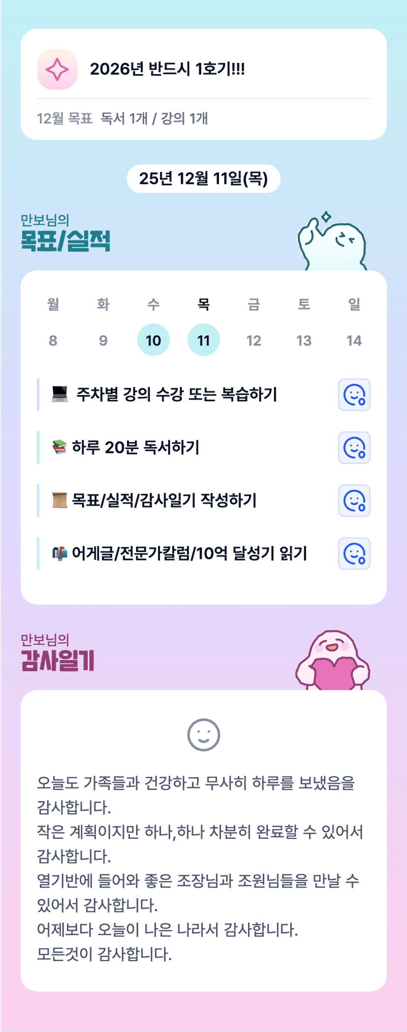 어제보다 오늘 더 나은 만보님~^^ 작은 계획과 행동이 하나 하나 쌓이고, 꾸준히 해나가신다면 어느새 목표를 닿아 있을 거라 믿어요! 우리 매일 조금씩 될 때까지 해나가요:)