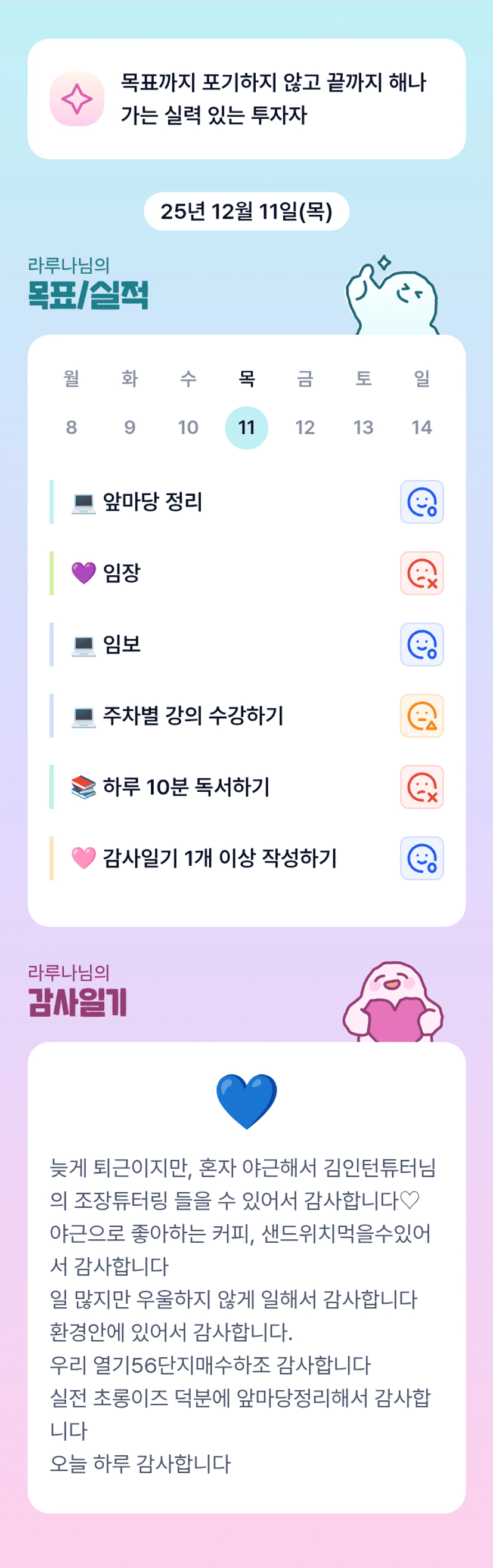 조장님 바쁘신 와중에 하나하나 목표, 실적 해나가는 모습 본받고갑니다~!