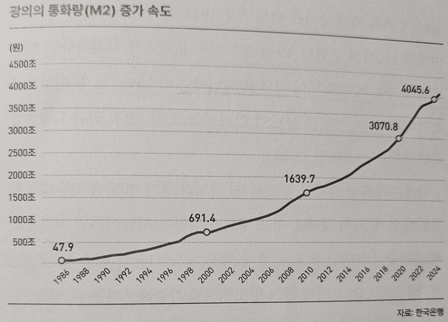 한국은행 발표에 따르면, 2024년 연중 평균 M2는 4045.6조원이다. 단순 살술하면 38년 사이 84.5배 증가했다. 2025년 5월 평균 M2는 4279.9조 원이다. 2024년 평균치와 비교할때 불과 1년도 지나지 않아 230조원 넘게 늘었다는 뜻이다.