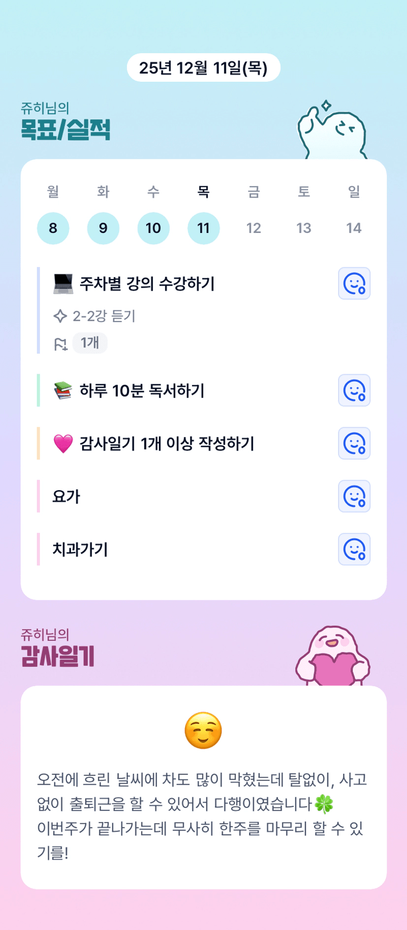 쥬히님 안전 운전!! 저도 지난 달에 교통사고 났었는데ㅠㅠ건강이 최고입니다요!! 오늘 독서도 강의도, 운동도 했던 알찬 하루였네요~ㅎㅎ내일도 파이팅입니닷