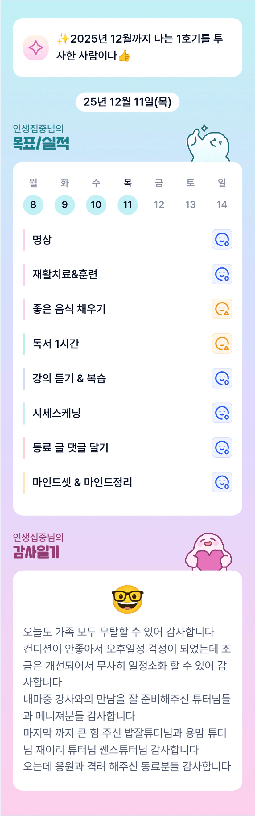 거의 매주 튜터님과 만남의 일정이 있으신 집중님 넘넘 멋집니다!!! 올 한해 무사히 지나가면 26년부터 건강 만수르 집중님 응원합니다~+