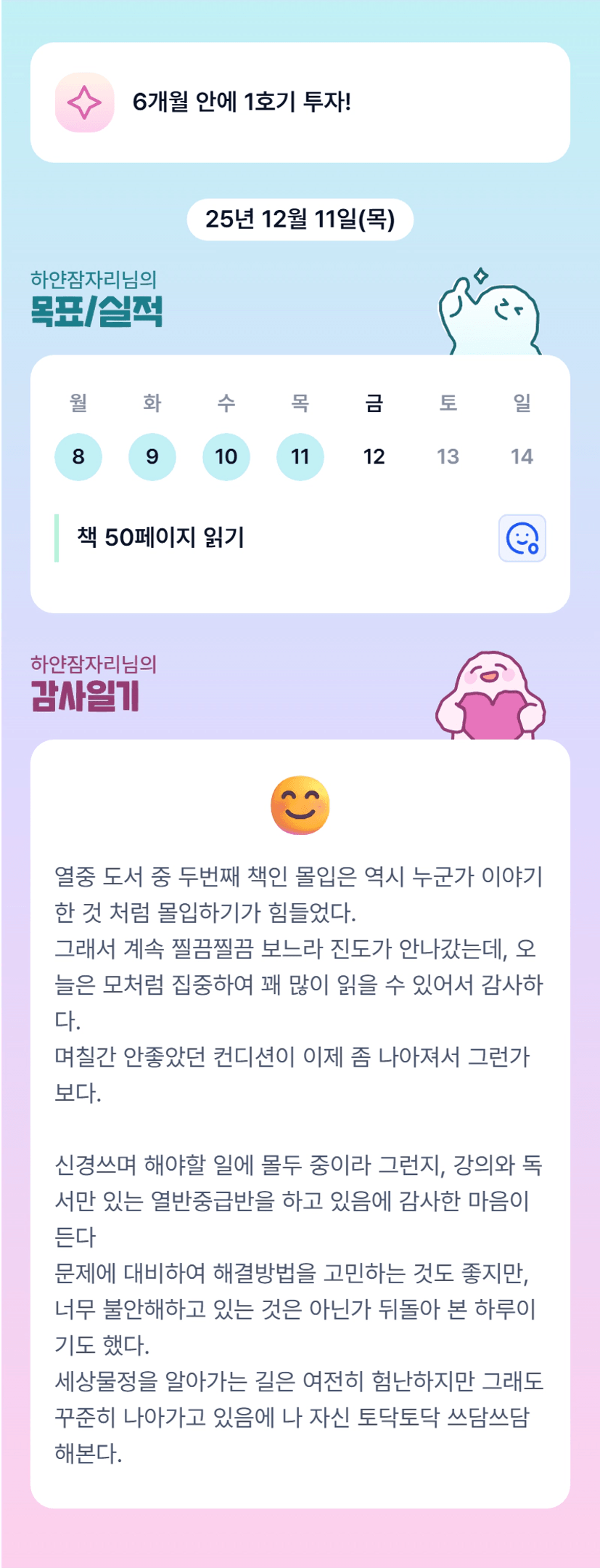 쓰담쓰담 토닥토닥이심당 🧡🧡🧡 오늘도 몰입되기 힘든 몰입책을 몰입하여 읽으시느라 고생많으셨슴당!! 🧡🧡🧡 ㅋㅋㅋㅋㅋㅋㅋ 책은 몰입인데 몰입이 안된다는건 참 모순이긴 하지만! 저도 어떻게 읽힐지 기대됩니다윸ㅋㅋㅋㅋ 불안을 다스리는 힘이 있으신 멋진 잠자리님>< 불안과 두려움을 뚫는 용기가 생기는 이번 한 달이 되시길 응원합니당! :) 멋지게 하루하루 나가시는 잠자리님은 충분히 용기있는 성장하시는 분이심당 🧡🧡 오늘하루도 성장하셨숨당!! 짜아앙!🧡🧡🧡