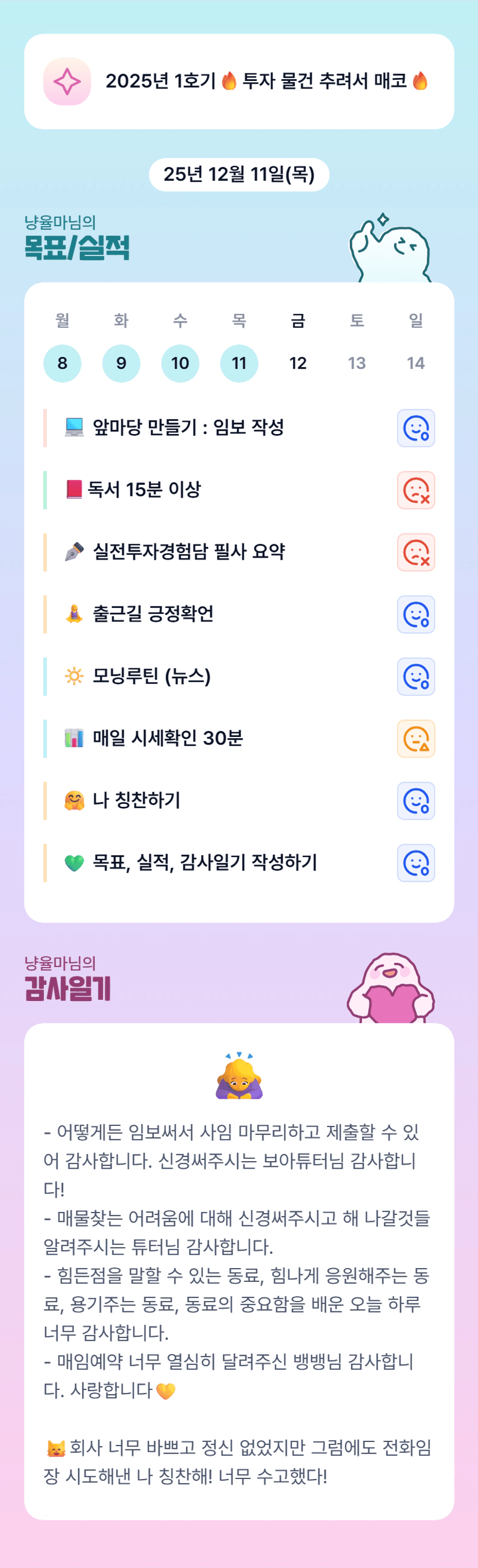 율마님~ 오늘도 고생많으셨어요 바쁜중에도 전화임장의 허들을 넘다니요 저도 칭찬100 드리겠습니다~~