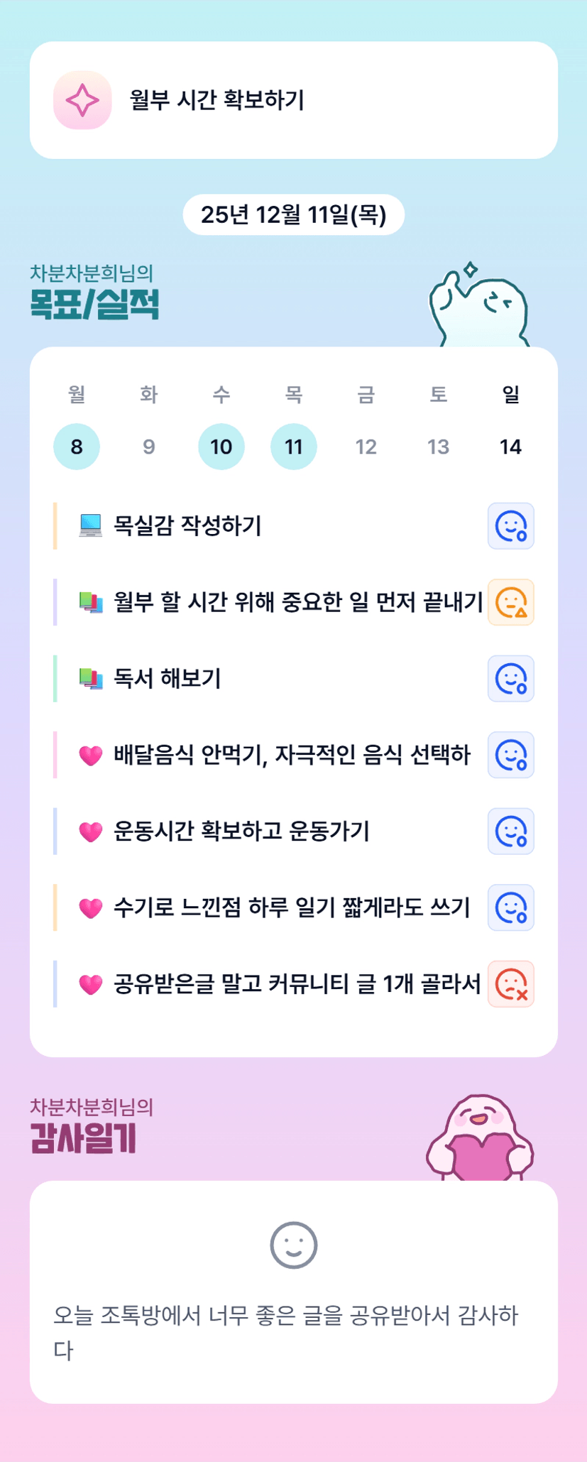 차분히님! 하나하나 생각해서 목표 계획하셨겠구나 느껴집니다^^ 계속해서 화이팅! 하세요^^