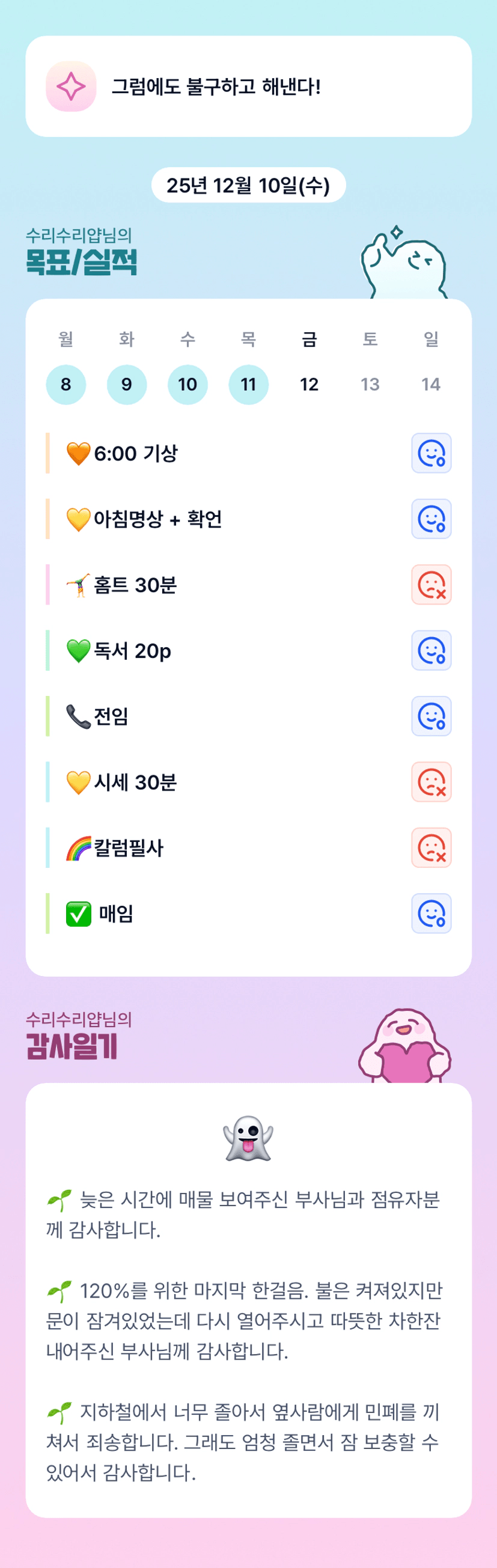 튜터님께 확신을 받으셨다니.. 역시 조장님은 하실 줄 알았어요!! 고수리, 전수리 등등 지켜보고 응원하겠습니당!! 건강 잘 챙기세요~