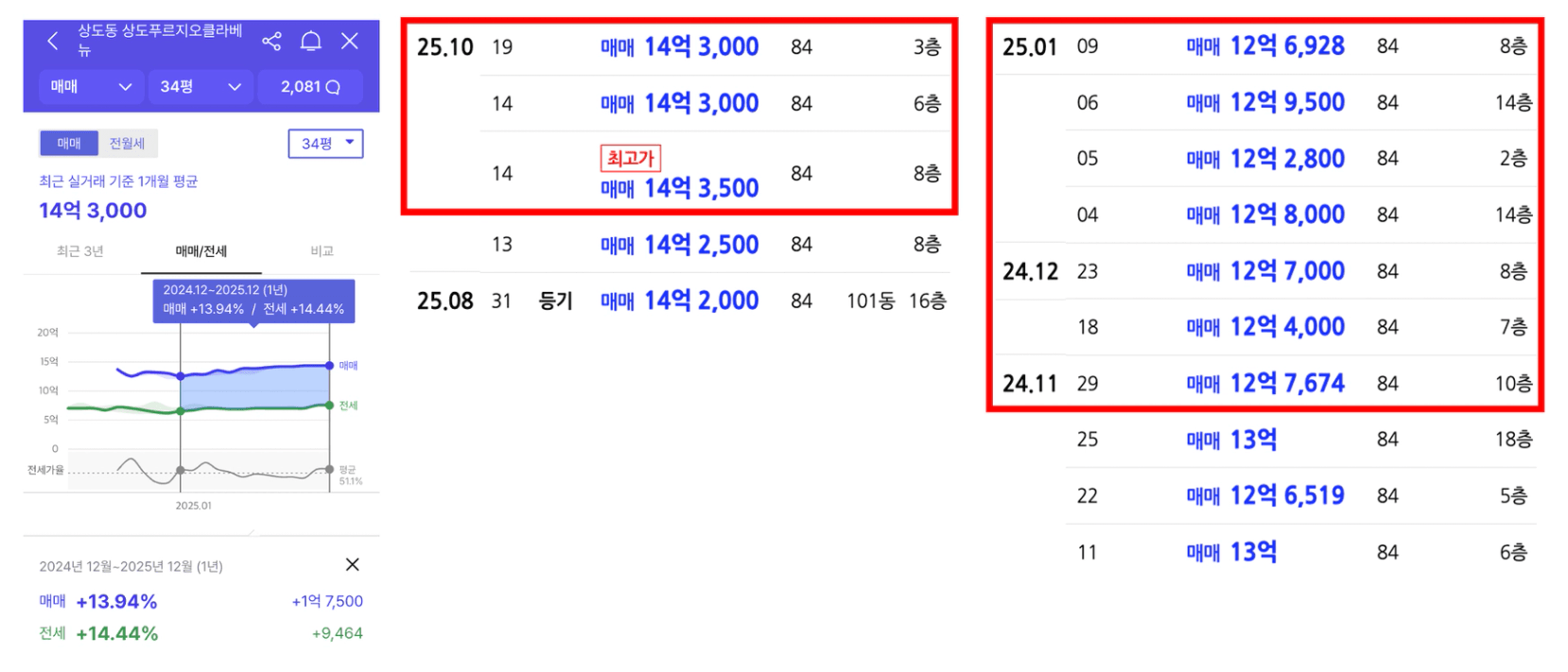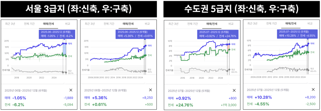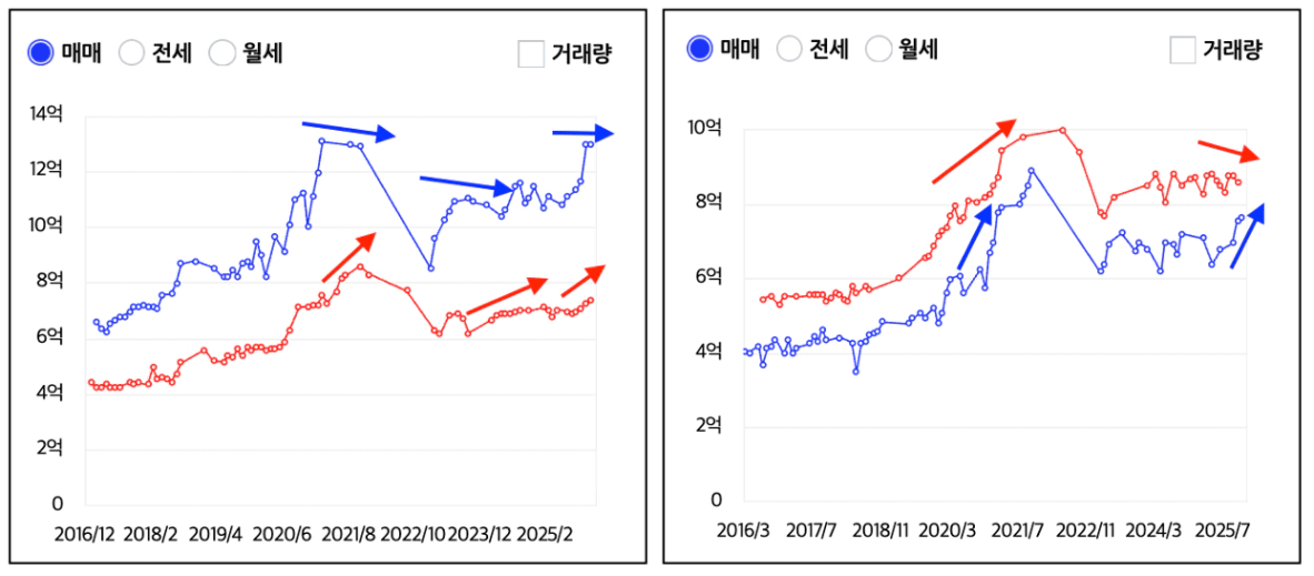 좌측 (파란색:신축, 빨간색:구축), 우측(빨간색:신축, 파란색:구축)