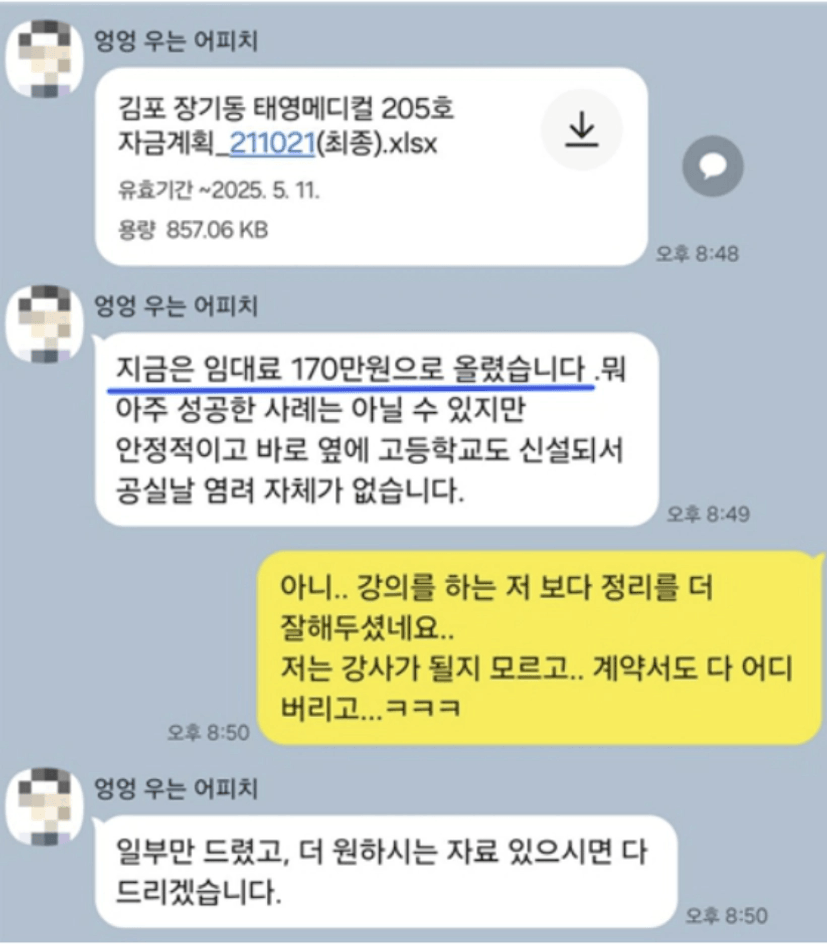 저의 조언에 따라 OO시의 학원가 상가를 매입하신 분과 나눈 카카오톡입니다.