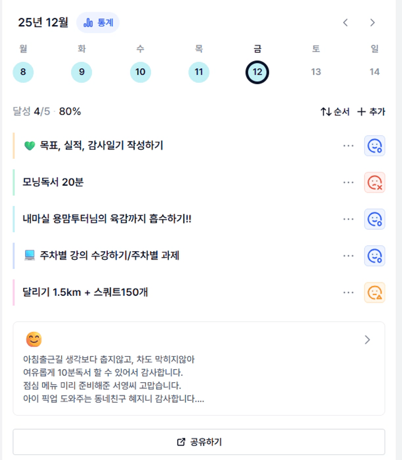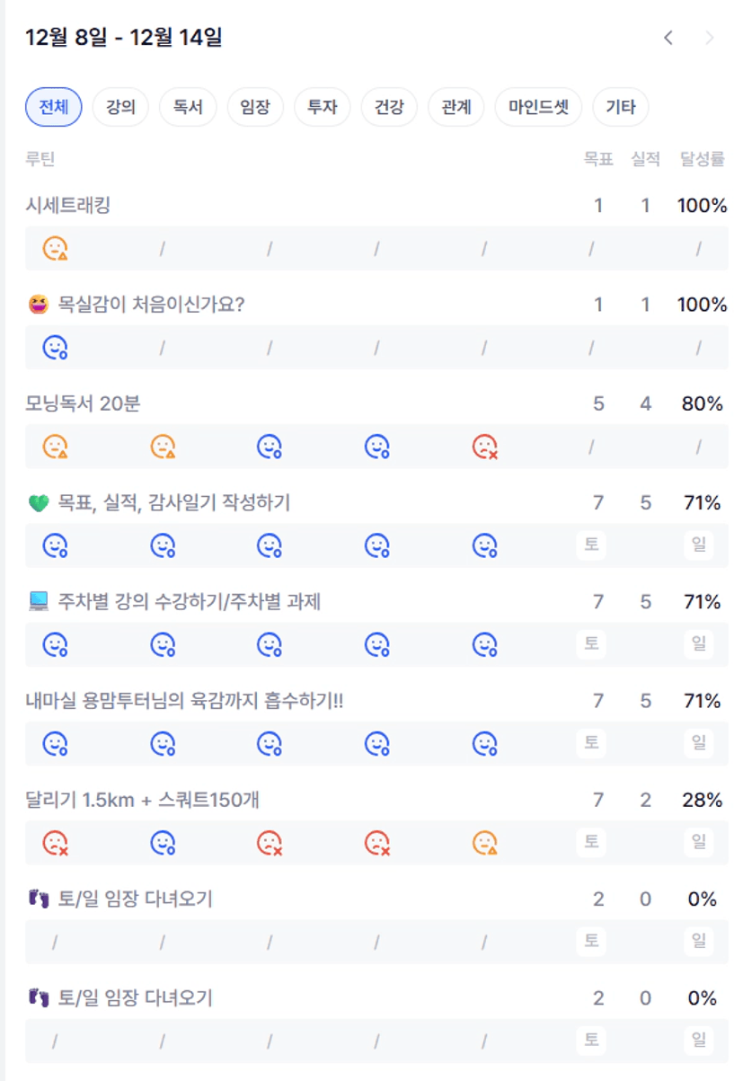 예) 토요일부터 목요일까지 목실감을 쭉 하루하루 적어보면서 스스로 중요한 부분은 놓치지 않고 해낸 것 같아 뿌듯하다.