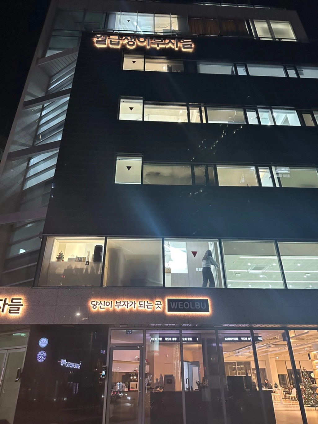 저녁 8시가 다 되었는데도 불이 꺼지지 않는 월급쟁이부자들 건물이 보이더라구요.