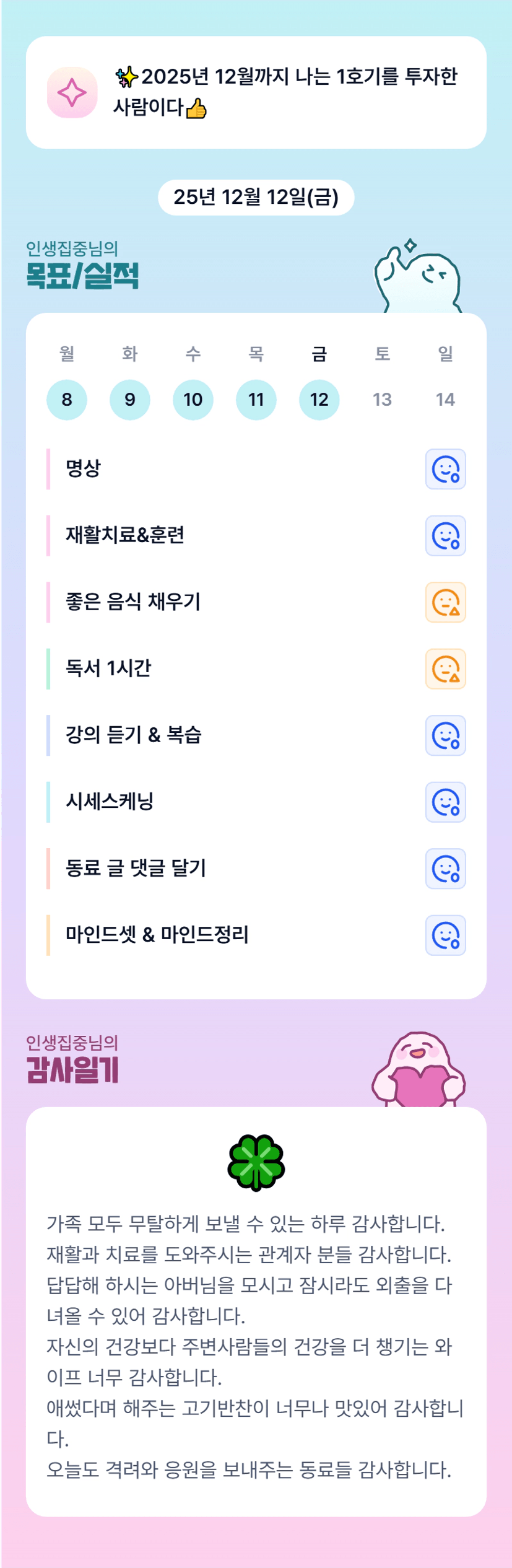 오늘 하루도 수고 많으셨습니다. 본인 뿐 아니라 가족과 주변 분들 모두 챙기시는 집중님 멋져요!👍