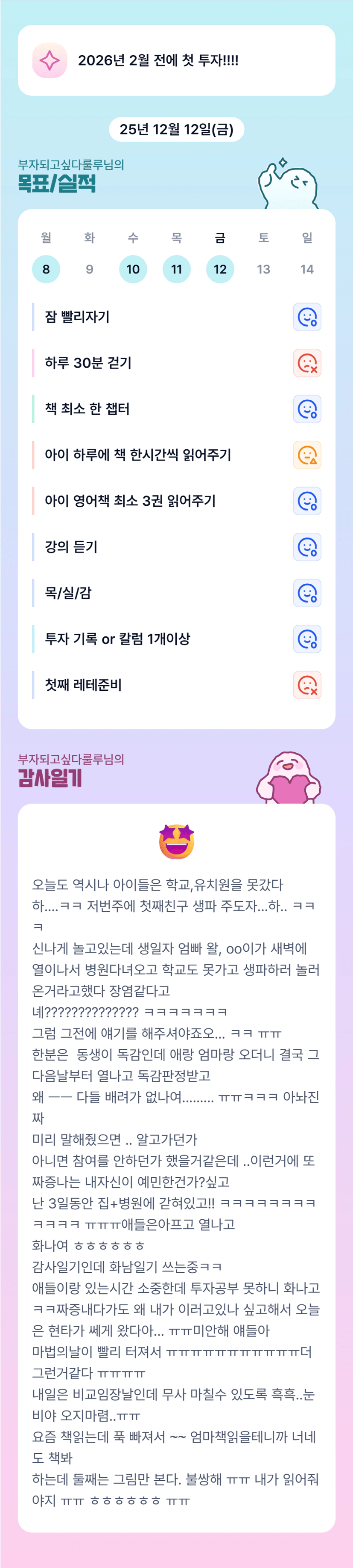 오늘 참 마음이 쉽지 않은 하루셨군영 ㅠ 증말 고생많으셨어여!! 해야할 일이 있는데 주변 환경이 안따라주고 ㅠ 화나고 속상하고 그러셨을거 같아용 ㅠㅠ 그래도 그 와중에도 독서하시고 강의들으신 룰루 조장님 역시 최고!! ㅎㅎ 정말 고생많으셨어용! 🧡🧡 토닥여주세용!! :)