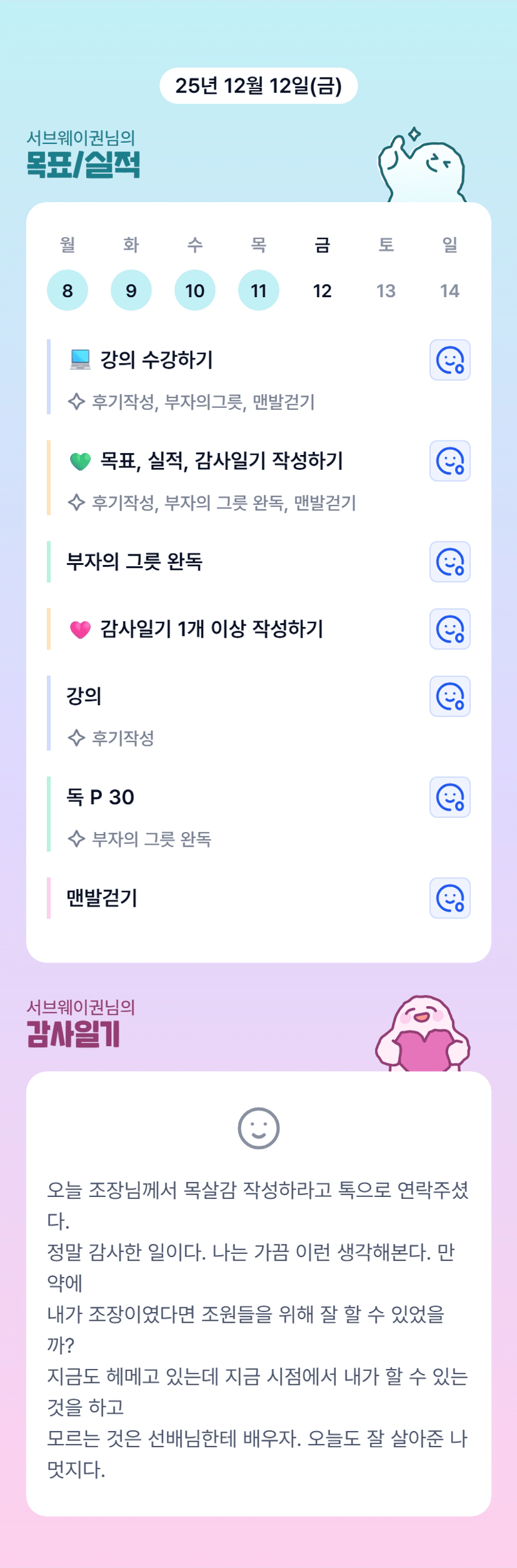 오~~목실감 고생하셨어요!!! 맞아요!! 권님 조장님 하셔도 잘하실거 같아요😆😆